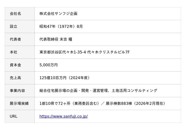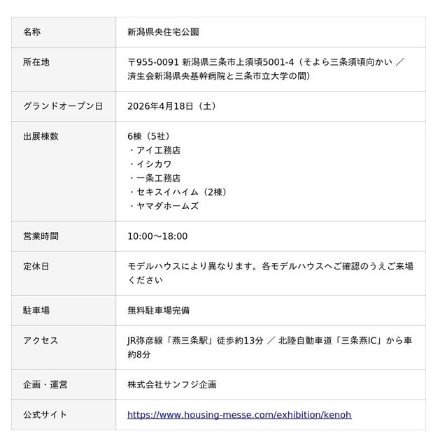 総合住宅展示場の企画・運営で1都10県・72ヶ所・883棟(2026年2月現在)を展開する株式会社サンフジ企画(本社:東京都渋谷区、代表取締役:末吉 糧)は、2026年4月18日(土)、新潟県三条市上須頃に「新潟県央住宅公園」をグランドオープンいたします。