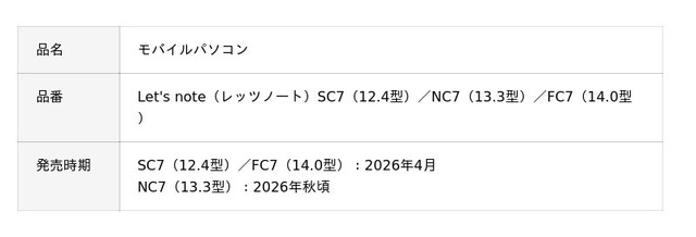 パナソニック コネクト株式会社(本社:東京都中央区、代表取締役 執行役員 プレジデント・CEO:樋口 泰行)は、「頑丈」「軽量」「長時間」に加え、AI処理性能が大幅に向上したレッツノート「SC7(12.4型)」「FC7(14.0型)」を2026年4月より発売します。「SC7」「FC7」はインテル(R) Core Ultra シリーズ 3 プロセッサー搭載 Intel vPro(R) プラットフォームに対応した、レッツノート初のCopilot+ PCです。また、モバイル性と作業性のベストバランスを追求したレッツノート「NC7(13.3型)」を新たなCopilot+ PCとしてラインアップに加え、2026年秋頃より発売開始予定です。