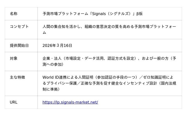 Institution for a Global Society 株式会社(本社:東京都渋谷区、代表取締役会長CEO:福原 正大、以下「IGS」)は、Tools for Humanity(以下「TFH」)とのパートナーシップのもと、本日2026年3月16日より予測市場プラットフォーム「Signals(シグナルズ)」β版の提供を正式に開始いたします。企業・法人での導入、一般の方による予測への参加が可能です。
