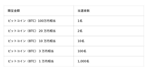 対象となる株主の皆様の中から、抽選により以下のとおり総額1,540万円相当のビットコイン(BTC)を贈呈いたします。