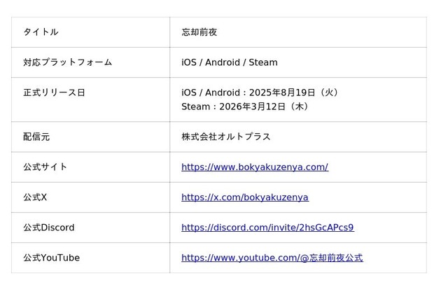 以上のほか、忘却前夜の概要につきましては、オルトプラスが2025年8月19日に配信した以下のプレスリリースにてご確認ください。