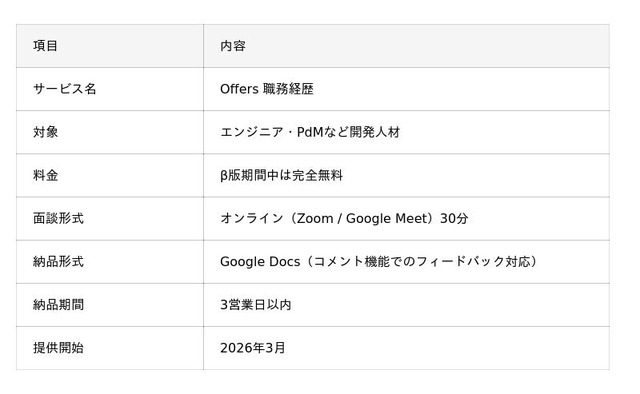 AI時代のエンジニア転職プラットフォーム「Offers」を運営する株式会社overflow(本社:東京都港区、代表取締役:鈴木裕斗)は、エンジニア・PdM向けに、専属コンサルタントによる深掘りインタビューとAIを組み合わせた「職務経歴書作成サービス」のβ版提供を2026年3月に開始しました。β版期間中はすべて無料でご利用いただけます。