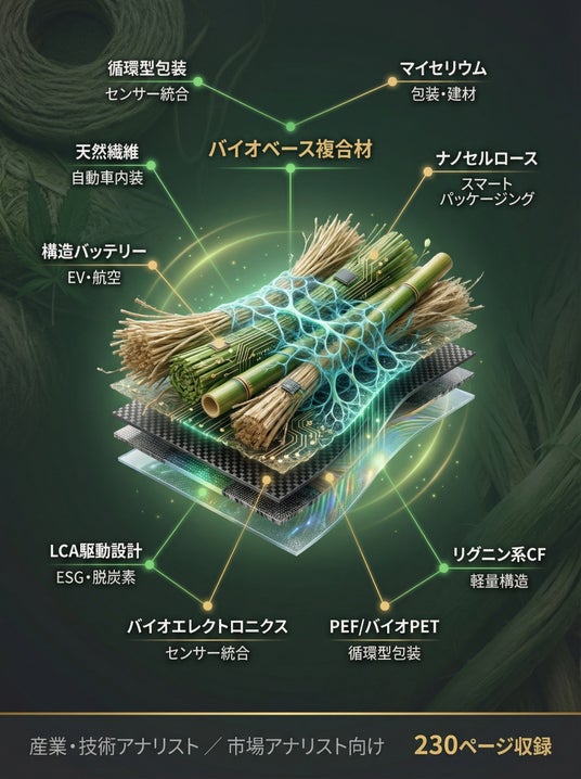 本白書は、バイオベース複合材料という戦略的新素材カテゴリーを「材料科学」「産業応用」「エレクトロニクス融合」「サステナビリティ設計」の4軸で体系的に解析した専門レポートである。