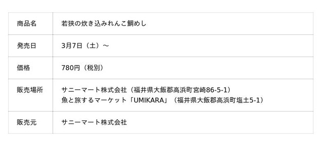 一般社団法人福井環境研究開発は、2025年に開催された海洋体験学習イベント「若狭小鯛(レンコダイ)調査隊」に参加した子どもたちの学びを広く全国に発信するため、地元高浜町の企業と共同で地元レンコダイを使ったオリジナル商品の開発を企画し、食品小売業のサニーマート株式会社が商品化、販売を開始しました。