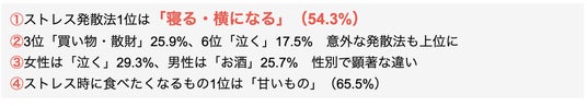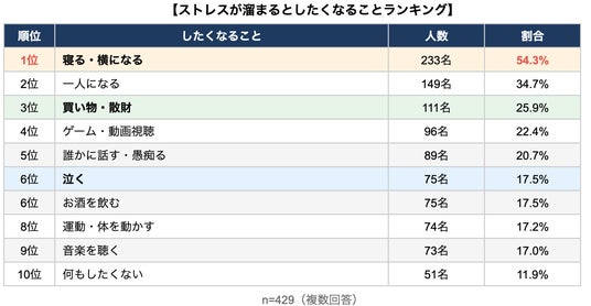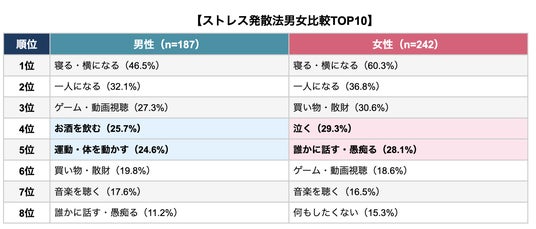また、「買い物・散財」が3位(25.9%)、「泣く」が6位(17.5%)に入るなど、意外なストレス発散行動も明らかになりました。