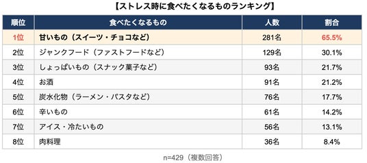 「ストレスが溜まると食べたくなるもの」を尋ねたところ、「甘いもの」が65.5%で圧倒的1位となりました。約3人に2人がストレス時に甘いものを求めています。