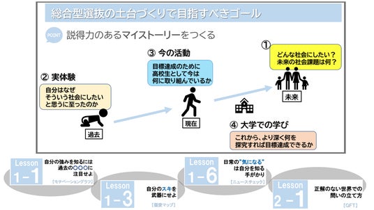 「試験官である大学教授が思わず納得してしまう」その受験生にしか紡ぎ出せない、過去・現在・未来が一貫した志望理由(マイストーリー)をつくるべく、具体的な活動の始め方や説得力の持たせ方を習得します。