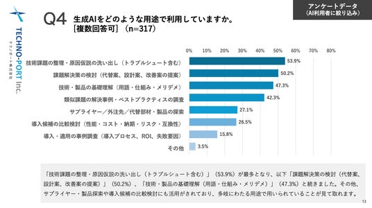 AIの具体的な利用用途としては、「技術課題の整理・原因仮説の洗い出し(53.9%)」や「課題解決策の検討(50.2%)」が上位を占めました。さらに、「サプライヤー/外注先/代替部材・製品の探索(27.1%)」や「導入候補の比較検討(26.5%)」といった購買・調達に直結する用途でも利用されています。