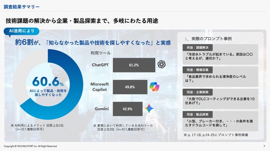 技術課題の解決から企業・製品探索まで多岐にわたるAI用途