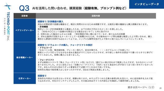 定性調査として実施したインタビューでは、実際に生成AIを活用して製品や技術の問い合わせや導入にまで至った経験について、その当時の流れやプロンプトに関するヒアリングを行いました。生成AIを効率的に用いた情報収集・購買行動が見受けられました。