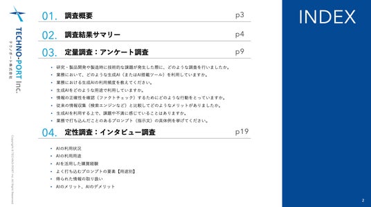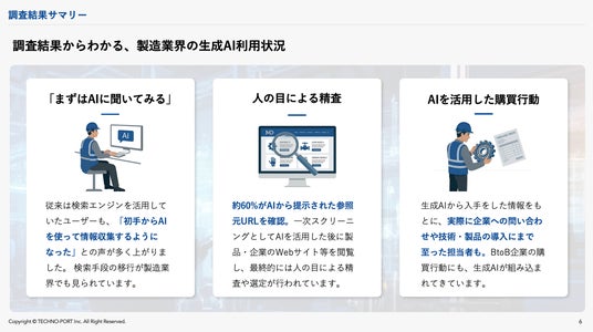 製造業向けのWebマーケティングサービスを提供するテクノポート株式会社(本社:東京都港区、代表取締役:徳山 正康)は、製造業における情報収集・購買プロセスにおける「生成AI」の利用実態に関する調査(2026年版)を実施しましたので、お知らせいたします。