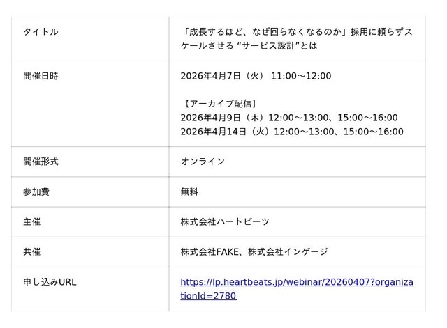 コミュニケーションプラットフォ-ム「Re:lation(リレーション)」を提供し、6,000社以上(※1)の導入実績を誇る株式会社インゲージ(本社:大阪府大阪市、代表取締役社長:和田 哲也)は、株式会社ハートビーツ、株式会社FAKEとの3社合同ウェビナー「『成長するほど、なぜ回らなくなるのか』採用に頼らずスケールさせる “サービス設計”とは」を2026年4月7日(火)に開催することをお知らせいたします。