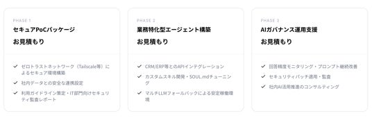 本サービスは、OpenClawの環境構築からセキュリティ対策、ガバナンス支援まで、法人導入に必要なすべてのプロセスをワンストップで提供するサービスです。