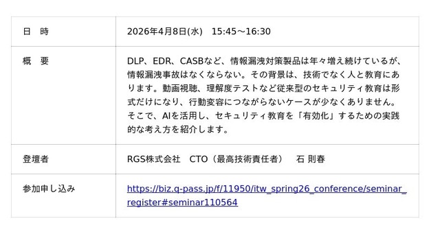 4月8日(水) なぜ情報漏洩は減らないのか ―製品だらけの時代に、AIで“効く”セキュリティ教育を実現する―