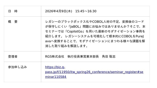 RGS株式会社(本社:神奈川県横浜市、代表取締役社長:余澤洋平)は、2026年4月8日(水)~10日(金)に、東京ビッグサイトで開催されるIT展示会「Japan IT Week 春」内の「ソフトウェア受託開発・開発支援 展」に出展いたします。また、カンファレンスにも各領域の専門家が登壇し、セキュリティ、モダナイゼーション、自動テストについて講演します。