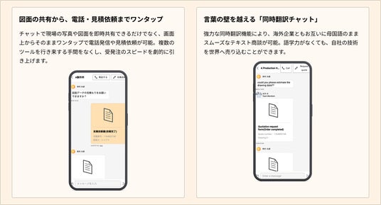 図面の共有から見積依頼、電話発信までスマホ画面からワンタップで完結。さらに、強力な同時翻訳チャット機能により、海外企業ともお互いに母国語のままスムーズなテキスト商談が可能です。語学力がなくても、自社の技術を世界へ直接売り込むことができます。