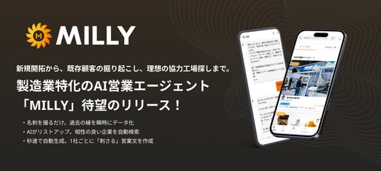 株式会社Milly(本社:東京都港区、代表取締役:北村 丈)は、製造業向け協働製造ツール『MILLY(ミリー)』において、ターゲット企業のリストアップから最適な営業メールの作成までをAIが自動で行う、製造業特化の「AI営業エージェント」機能を本格リリースいたしました。