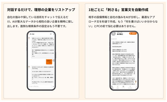 そこで誕生したのが、私に代わって1社1社の要件を丁寧に聞き、最適なパートナーを探し出し、刺さる文章を作ってアプローチしてくれる新機能『AIジョー(AI営業部長)』です。彼がこの「攻め」のマッチングを担うことで、1社でも多くの企業様に協業していただき、職人の皆様が本来の「ものづくり」に100%専念できる会社を増やしてほしいと切に願っています。