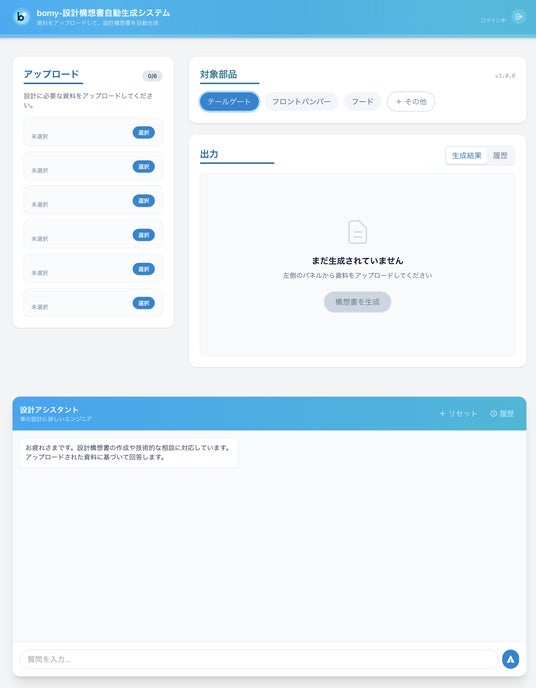 アンティナ株式会社(所在地:愛知県名古屋市、代表取締役:安藤 一、以下「アンティナ」)は、自動車開発の最上流工程において、製品企画書等の情報を構造化し設計構想書のドラフト作成を支援するシステム「bomy(ボミー)」(以下「bomy」)の開発を進めており、一部の顧客に対して限定先行提供を開始しました。
