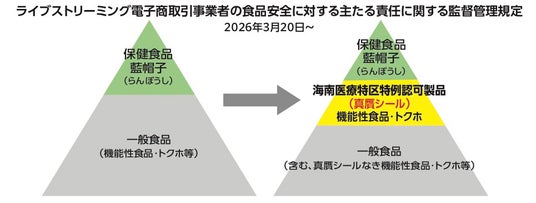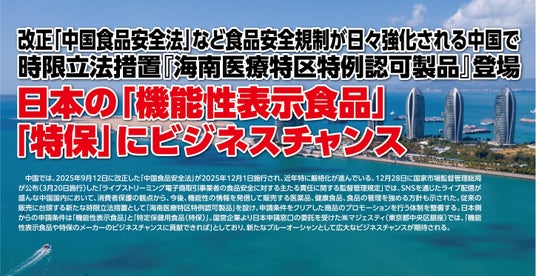 中国では、2025年9月12日に改正した「中国食品安全法」が2025年12月1日施行され、近年特に厳格化が進んでいる。12月28日に国家市場監督管理総局が公布(3月20日施行)した「ライブストリーミング電子商取引事業者の食品安全に対する主たる責任に関する監督管理規定」では、SNSを通じたライブ配信が盛んな中国国内において、消費者保護の観点から、今後、機能性の情報を発信して販売する医薬品、健康食品、食品の管理を強める方針も示された。