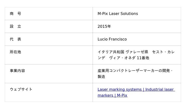 M-Pixは、産業用コンパクトレーザーマーカーの開発・製造を手がけており、主に半導体レーザー、ファイバーレーザーを中心とした製品群を展開しています。2015年の設立以来、世界市場に6,000台以上のレーザーマーキングユニットを供給した実績を持ちます。製品は小型・軽量で装置への組み込みやすさに優れているほか、操作性に配慮したソフトウェア設計を特徴としており、医療分野向けアプリケーション開発にも適した設計基盤を備えています。