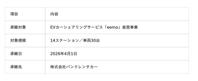 EVマネジメントシステムの開発・提供を行う株式会社REXEV(本社:東京都千代田区、代表取締役:渡部 健、以下「REXEV」)と、株式会社D&Dホールディングスのグループ会社である株式会社バンクレンタカー(本社:東京都中央区、代表取締役:小熊 浩、以下「バンクレンタカー」)は、REXEVが運営するEVカーシェアリングサービス「eemo(イーモ)」の直営事業を、2026年4月1日付でバンクレンタカーへ事業承継することについて決定いたしましたのでお知らせいたします。