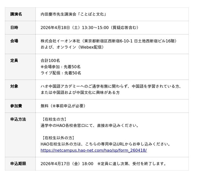 株式会社イーオン(本社:東京都新宿区、代表取締役社長:重野卓、以下「イーオン」)が運営するハオ中国語アカデミーは、2026年4月18日(土)、一般財団法人日本中国語検定協会(以下「中検協会」)理事長の内田慶市氏を講師にお迎えし、特別講演会「ことばと文化」を開催いたします。