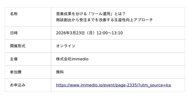 “次の一手”がデータでわかるMA+SFA一体型ツール「Kairos3(カイロススリー)」を提供するカイロスマーケティング株式会社(本社:東京都渋谷区、代表取締役:佐宗 大介、以下「当社」)は、株式会社immedioが主催するオンラインセミナー「営業成果を分ける『ツール運用』とは?商談創出から受注までを改善する生産性向上アプローチ」に、当社取締役 COO 白井 則行が登壇することをお知らせします。