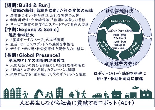 - 短期「Build & Run」フェーズ:社会実装を加速し、データと現場知を蓄積して競争力の基盤を強化していくことが重要。産業用ロボット等を核として、「信頼の基盤」の蓄積を踏まえた社会実装を加速すべき
