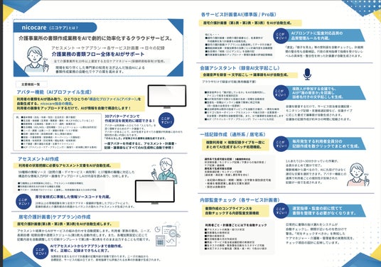介護業界では慢性的な人手不足に加え、アセスメントやケアプランなどの書類業務が現場の大きな負担となっています。nicocareは、こうした書類をAIで自動生成することで業務時間を大幅に削減するサービスです。