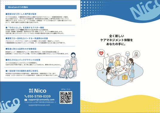 nicocareは、「数クリックで操作完結」「導入まで1~2日」「専門職監修の文章生成」という設計により現場導入のハードルを徹底的に下げています。