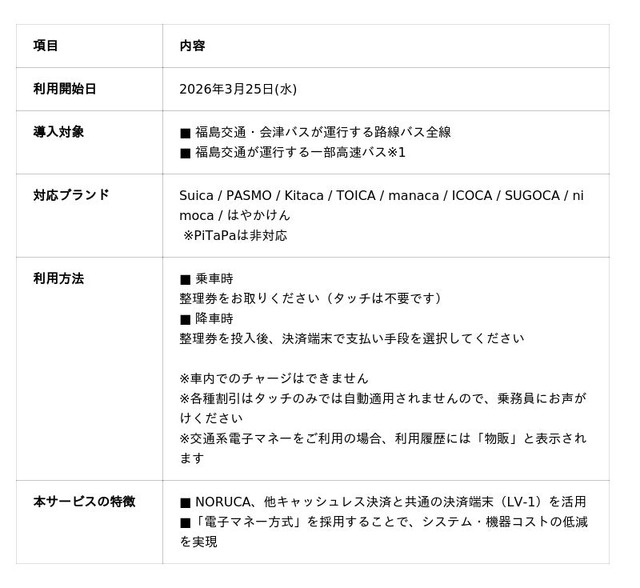福島交通・会津バスでは、これまで地域のお客様向けのICカード「NORUCA(ノルカ)」、「AIZU NORUCA(アイヅノルカ)」のほか、クレジットカード等のタッチ決済、QRコード決済、電子マネー(WAON、nanaco)などのキャッシュレス決済手段を導入してまいりました。今回、新たに交通系電子マネーが利用可能となることで、県外からの来訪者や観光で訪れるお客様などが、お手持ちのSuica/PASMO等でそのままバスをご利用いただけるようになります。