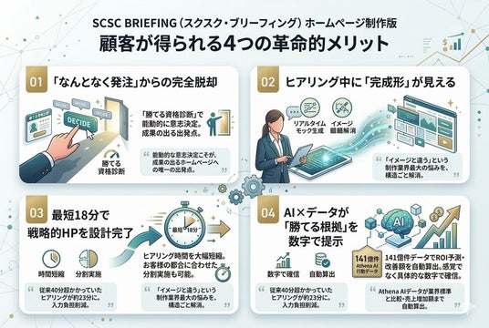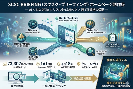 株式会社ガーディアン(代表取締役:青山裕一、所在地:東京都)は、ホームページ制作業界における構造的な課題を根本から解決するインタラクティブ型ヒアリングシステム「SCSC BRIEFING(スクスク・ブリーフィング)ホームページ制作版」を正式にリリースします。本システムは、Athena AI(141億件の行動データを持つ因果推論エンジン)・独自の3D-CMF理論・OWLet CMS(500万パーツ・15年間脆弱性ゼロ)・77's Check!!・SCAN DOGという5つのコア技術を統合し、「発注前の体験から納品後まで」を一気通貫で設計します。