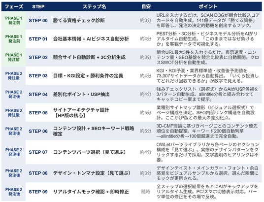 PHASE 1(発注前体験フェーズ:STEP 00~02) 合計約10分PHASE 2(発注後ヒアリングフェーズ:STEP 03~09) 合計約31分