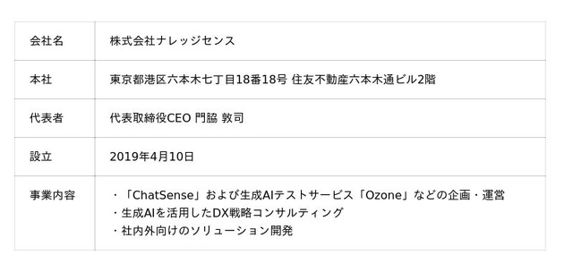 ナレッジセンスは、企業や行政・自治体向けのDXを加速し、あらゆる社員の生産性を向上させるため、ビジネス向けChatGPTサービス「ChatSense」・事業コンサルティングを提供しています。ChatSenseだけでなく、生成AIに関する複数のサービスをリリースし、グローバルのユーザーに提供している実績がございます。ナレッジセンスでは、生成AIを活用して社員の業務効率を加速したい企業や行政機関からのご相談をお待ちしております。https://knowledgesense.jp/