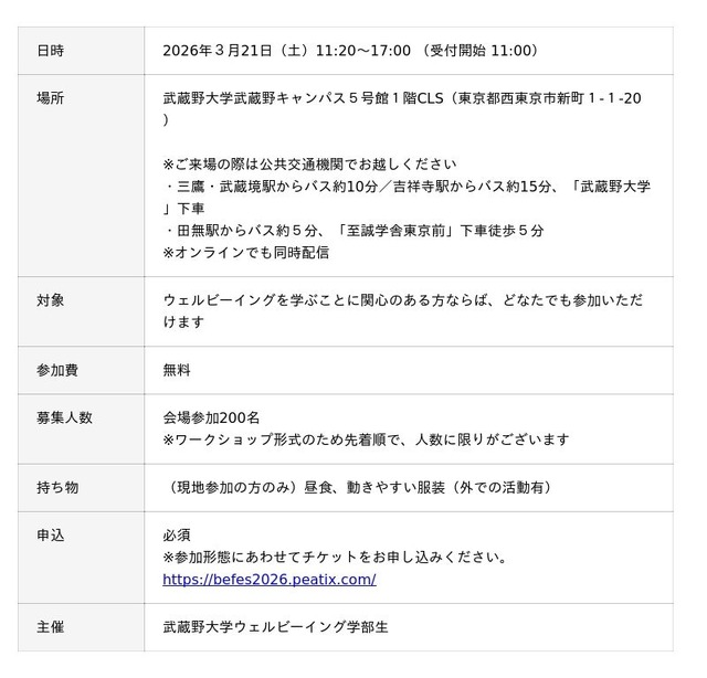 武蔵野大学ウェルビーイング学部(東京都西東京市、学長:小西 聖子)は、3月21日(土)にウェルビーイング学部生主催のスペシャル企画「ビーフェス」を開催します。本イベントは、「THE WELLBEING WEEK 2026」のコンテンツの一つとして開催されるものです。2017年からスタートした「THE WELLBEING WEEK」は今年10周年を迎え、本年は3月13日(金)より世界幸福デーである3月20日を含む10日間にわたって開催されます。
