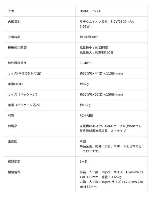 重さはわずか約97gの軽さなのに、最大12時間の連続使用が可能です。(※風量最小時の時間です、使用風量により異なります)朝から夜まで、これ1台で一日中涼しさをキープできます。
