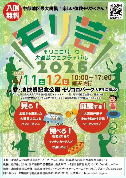 事業名:第14回モリコロパーク大道芸フェスティバル(モリ芸2026)日時:令和8年4月11日(土)12日(日) 10:00~17:00 雨天決行