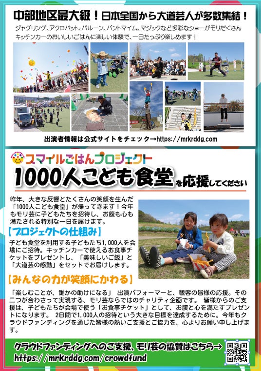 モリ芸に、子ども食堂を利用する地域の子どもたちや児童養護施設の子どもたちを招待し、キッチンカーの食事と大道芸を存分に楽しんでもらおうという企画です。