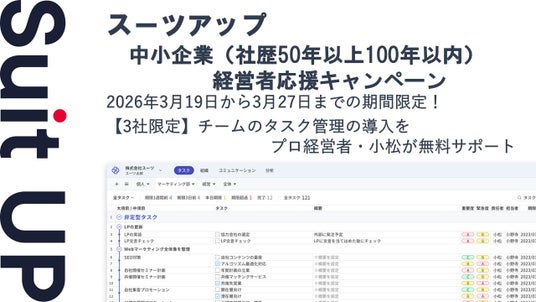 2026年3月19日から27日までの期間に、スーツアップの無料お試しにお申込みいただきました中小企業(社歴50年以上100年以内)経営者でチームのタスク管理を導入する予定のうち3社限定で、当社代表者であり中小・中堅企業やスタートアップのバリューアップに実績のあるプロ経営者の小松自ら、チームのタスク管理の導入サポートを無料で行うキャンペーンを実施します。