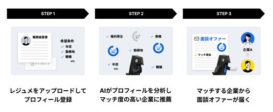 AIが求職者に合った企業をピックアップし、企業はAIに推薦された求職者に対してのみオファーを送るため、求職者のキャリアや志向にマッチしたスカウトだけが届きます。