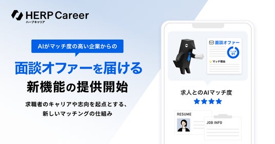 株式会社HERP(本社:東京都品川区、代表取締役:庄田一郎)は、求人メディア『HERP Career』(ハープキャリア)において、AIがマッチ度の高い企業からの面談オファーを届ける新機能を提供開始しました。採用管理システム『HERP Hire』の採用実績統計データを活用し、マッチング可能性の高い企業からのオファーを届けるため、求職者は厳選された「本当に合う企業」とだけ面談することができます。
