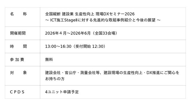 建設ICTの専門企業として、全国の建設現場の課題解決を支援する株式会社シーティーエス(本社:長野県上田市、代表取締役 社長執行役員:横島 泰蔵、以下CTS)は、4月1日「建設業DX推進の日」に合わせ、2026年4月より6月にかけて「全国縦断 建設業 生産性向上 現場DXセミナー2026」を全国33会場で開催いたします。