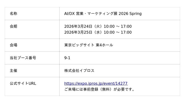 「AI/DX 営業・マーケティング展 2026 Spring」は、BtoBマッチングプラットフォームを運営する株式会社イプロスが開催する展示会です。営業・マーケティングにおける課題を解決するAIやDX関連のサービス・ソリューションが一堂に集結します。
