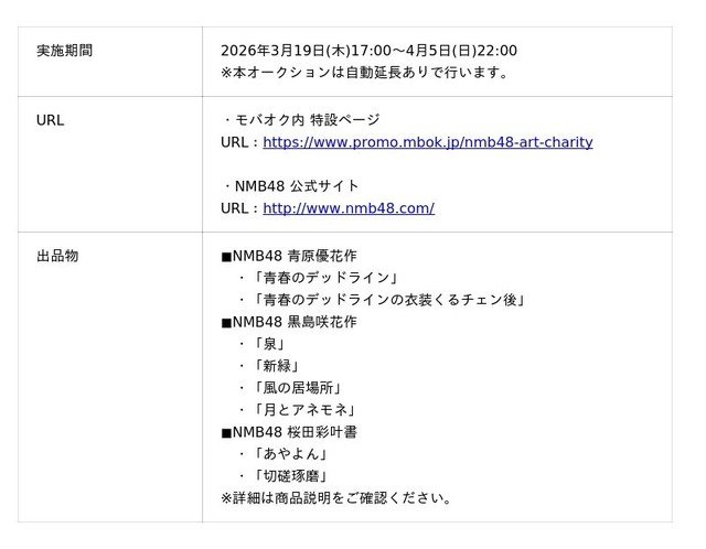 本オークションは、NMB48のメンバーが、「発想」や「個性」を主役にした、さまざまな美術作品を創作していく企画にモバオクが連携し、作品を出品いただく内容となります。
