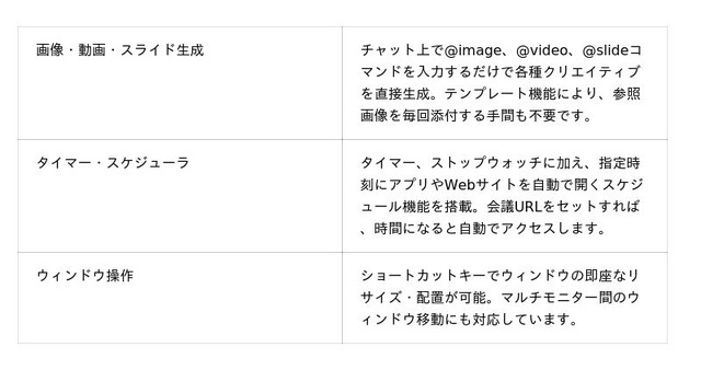 正式版では、Windows対応、Teamプラン対応、AI議事録機能、オリジナルアイコン設定など、大型機能が追加されます。個人の作業効率化にとどまらず、チームや組織でも本格的に活用できる組織共通のデスクトップAIへと進化します。
