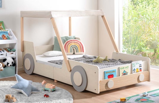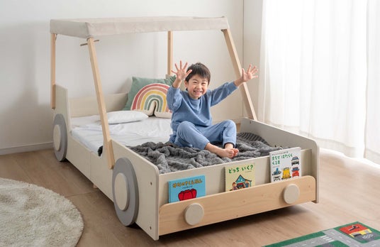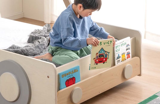 フロントのバンパー部分は、ぬくもりある天然木を使用したディスプレイラックになっており、お気に入りの絵本を飾ることで眠る前の読み聞かせ習慣も楽しくサポートします。