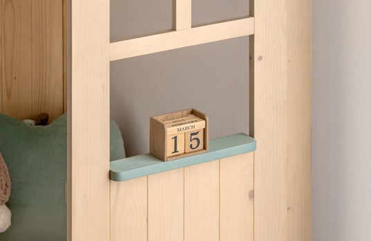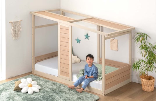 ナチュラルなパイン材の風合いを活かした佇まいは、別荘へお泊まりしているような特別な高揚感を演出し、毎日のおやすみ時間をワクワクするひとときへと変えてくれます。