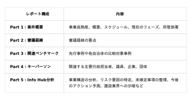「公共事業 予兆・案件リスト」の中から関心のある案件について、オーダーメイドで「公共事業 予兆・案件詳細レポート」を作成します。レポートは以下の5部構成で、事実情報と分析情報を明確に区別して提供します。