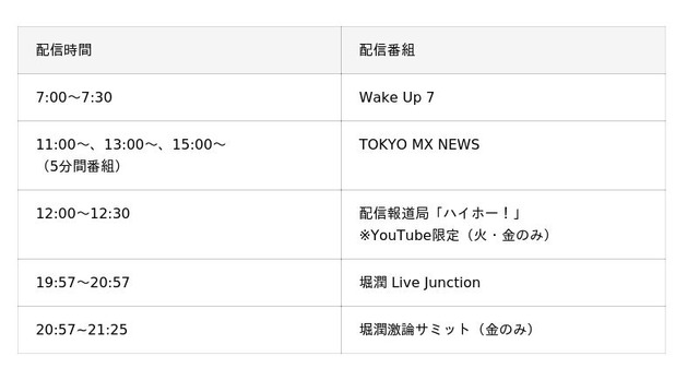 東京メトロポリタンテレビジョン株式会社(TOKYO MX)は、4月1日(水)から、TOKYO MXで放送中の報道情報番組『Wake Up 7』、『TOKYO MX NEWS』、『堀潤 Live Junction』などを中心に、TOKYO MX報道局のYouTubeチャンネル(TOKYO MX NEWS)で24時間生配信することを決定いたしました。同時生配信を通じて、これまで放送をお届けできなかった東京エリア外の皆様にもタイムリーに情報をお届けするとともに、更なる視聴者の拡大を図ってまいります。